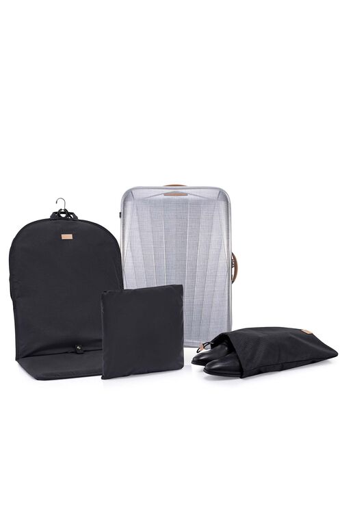 7. 附贈豐富的旅行配件,如登機箱附有打包袋、箱套及鞋袋,託運箱內含西裝掛、箱套及鞋袋。